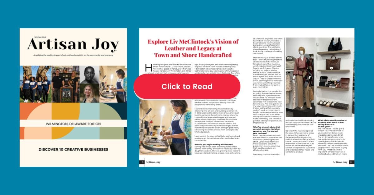 Your efforts have not gone unnoticed. This magazine will undoubtedly have a significant impact on the Wilmington and Brandywine Valley area, highlighting our community and the wonderful small businesses that contribute to its charm. Your work, along with the Artisan Joy team, will help showcase the unique artisans in our region, fostering greater appreciation and support for their craft."