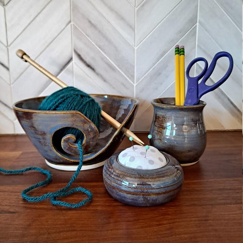 For crafters who do it all, this ceramic set from kbellclayshop on Etsy will be a welcomed addition to their space. This handmade set includes a yarn bowl, pin cushion and tumbler for organizing supplies.