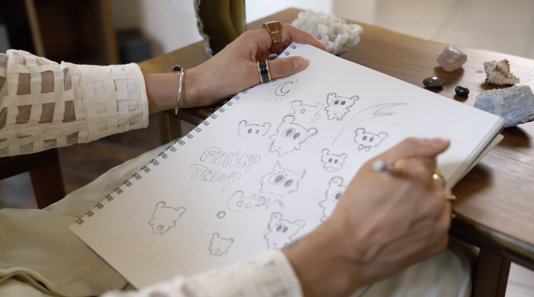 I found myself at a crossroads in life. After starting a career in interior design and dabbling in everything from acting and modeling to working at my family's travel and cargo business, I realized I wasn’t feeding my soul. I’ve always been into sound baths, meditation and crystals, so I attended a sound bath with the intention to really listen to myself. All I could see during the session was the Fancy Teddy—a character I used to doodle as a child. I realized I had two choices: continue on my current path or take a chance on myself and bring Fancy Teddy to life. As a toy lover and collector, I knew I wanted to turn Fancy Teddy into the collectible art toy of my dreams. After that sound bath, I put in my two weeks’ notice and turned a nameless doodle into what it is today: a one-of-a-kind, hand-sewn art toy stuffed with healing crystals. I combined all my previous paths and passions and poured them into what I now know is my calling.